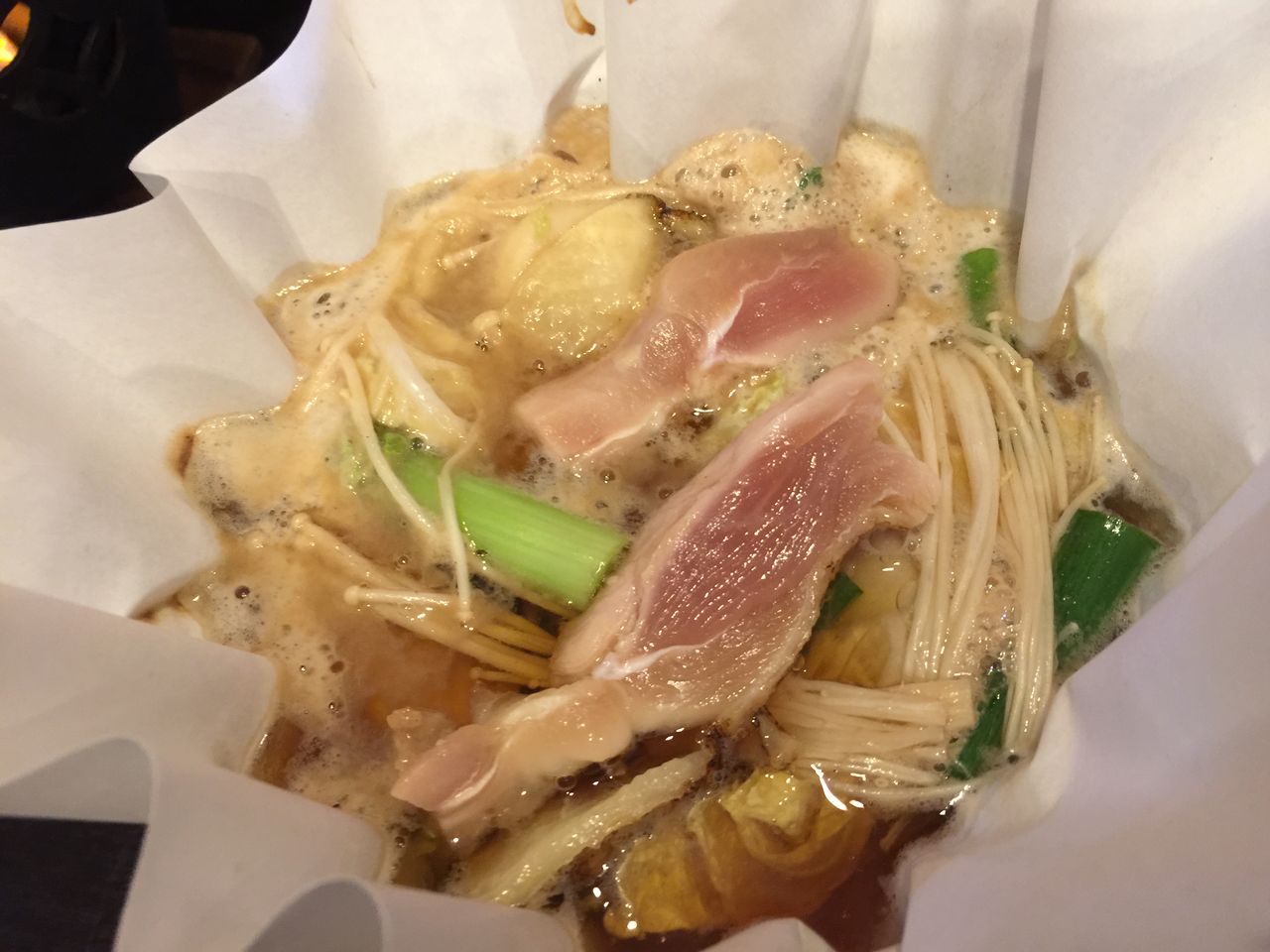 鍋の味は、見た目とは違い、スープが結構濃い味ですき焼きに近い感じの味でした。