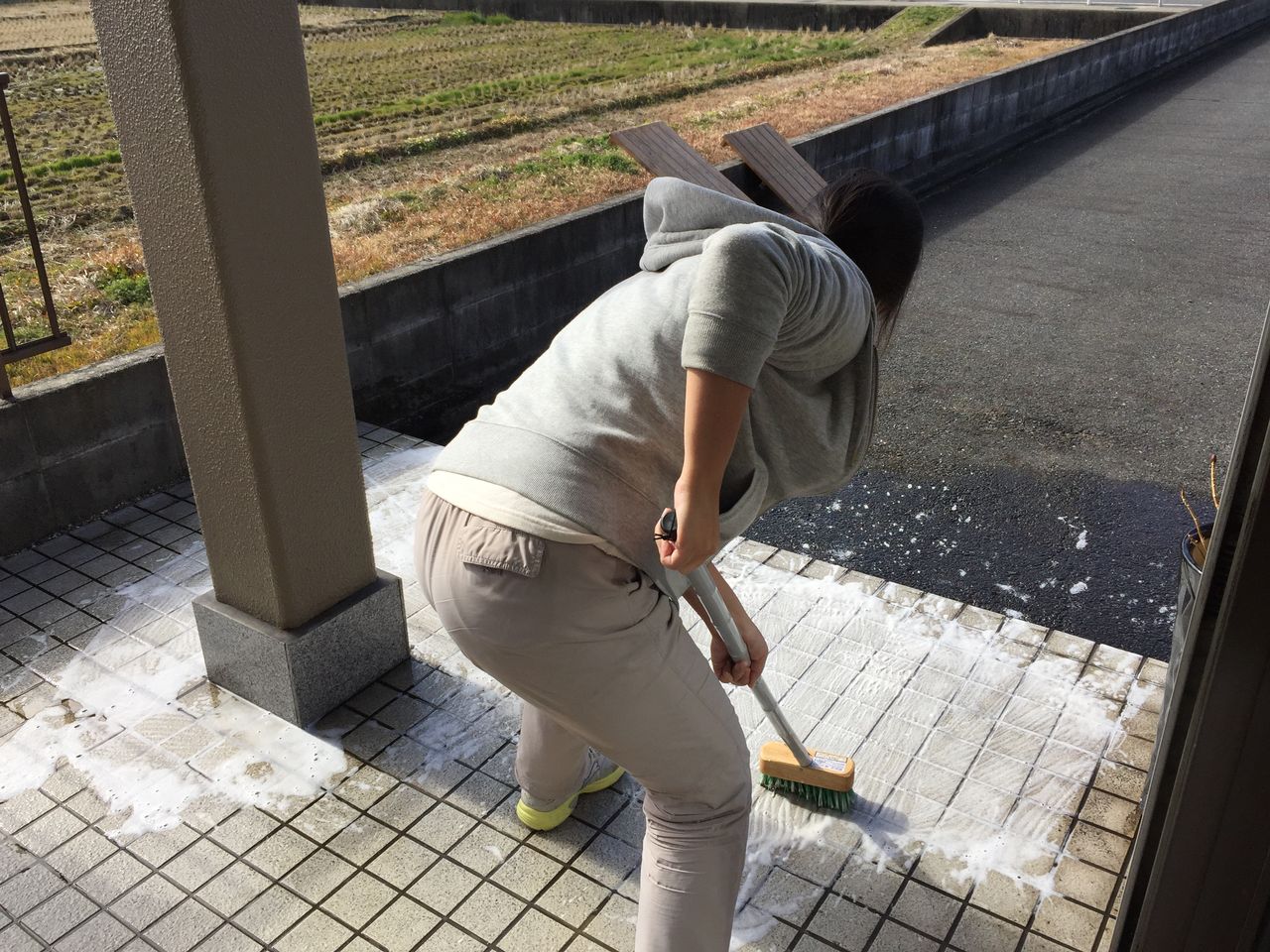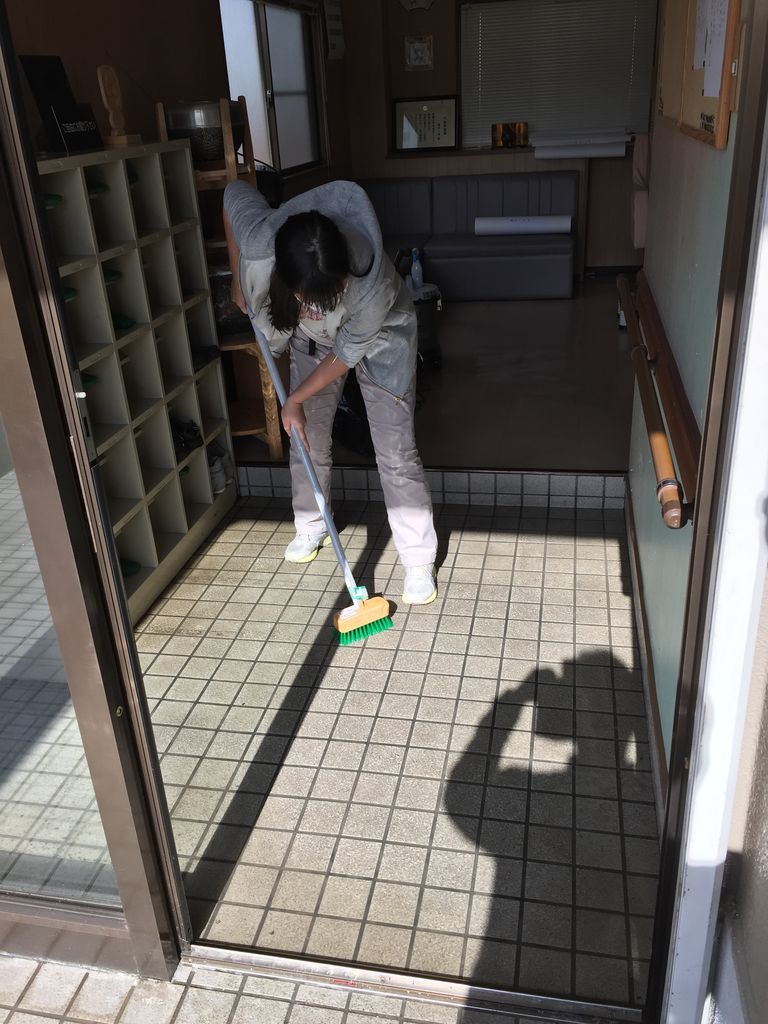 デッキブラシで玄関入口をしっかりと擦って頂きました