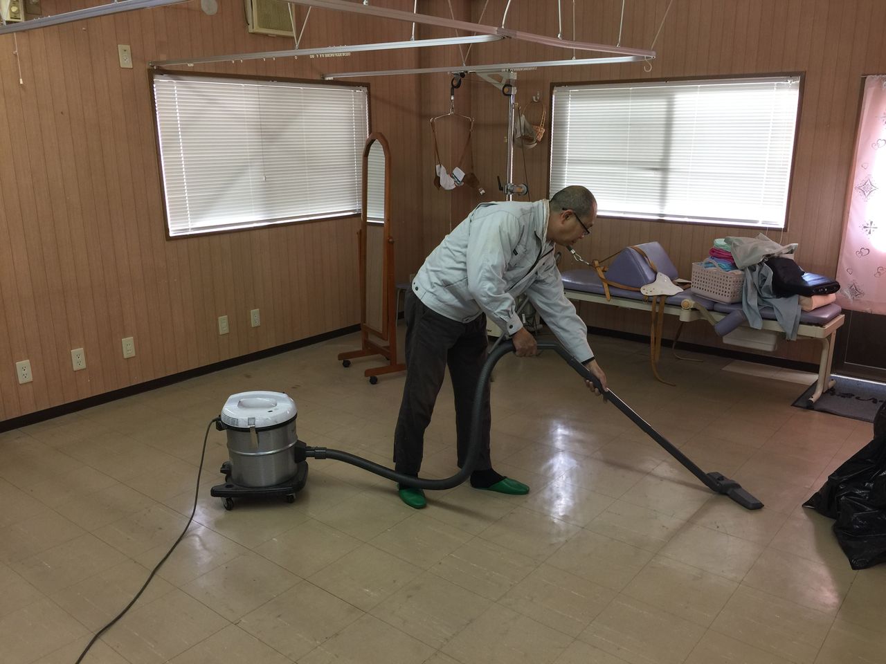 ☝院内を①箒でゴミを集め②掃除機を使って掃除③薬剤を使用後、モップを使っての水拭き作業
