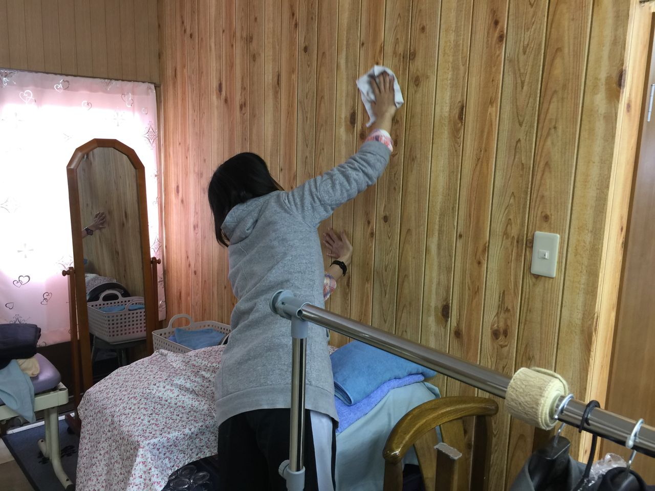 最初に、カーテンレールからカーテンを取り外し、外したカーテンを洗濯機にて洗濯。