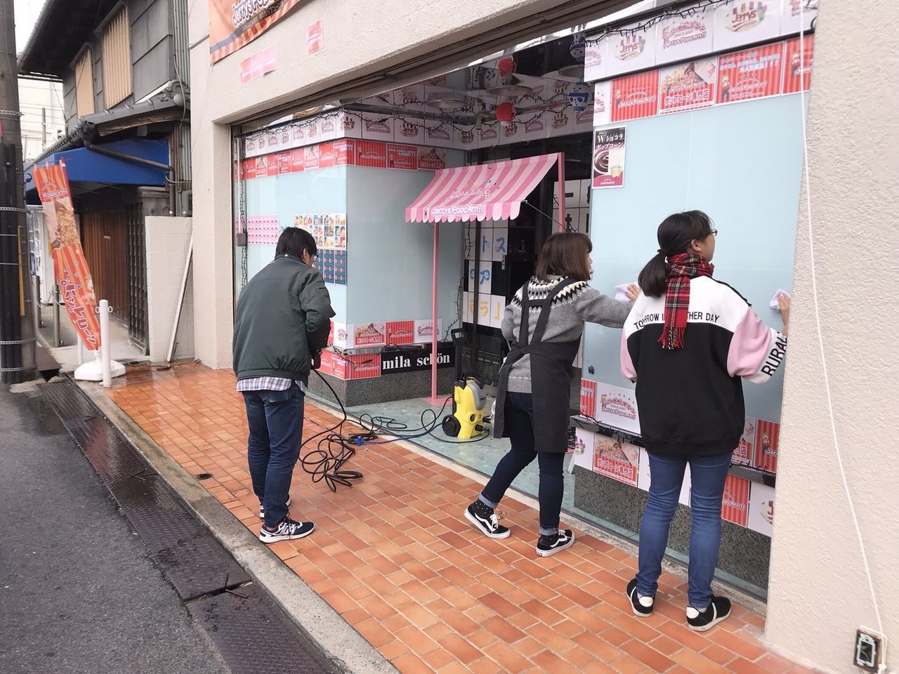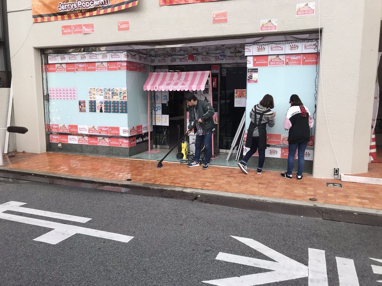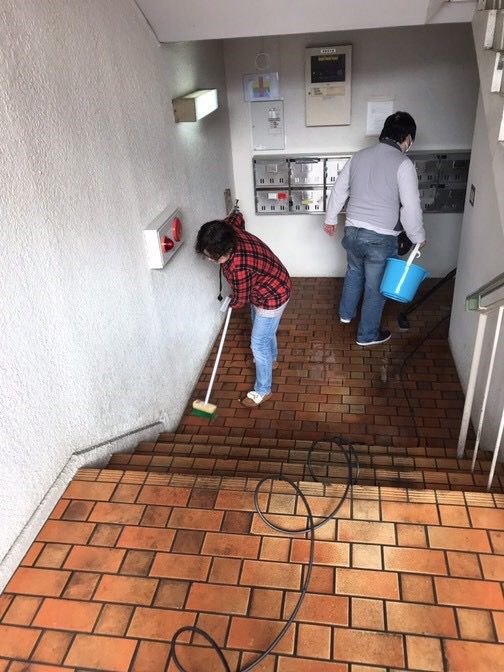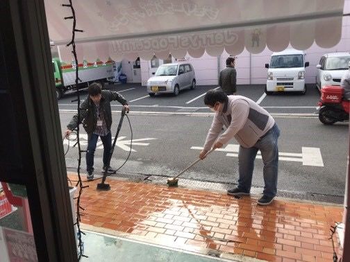 👆先日購入した、掃除用具「ケルヒャー」をみんなで使い大きな窓ガラスや床タイルを綺麗に高圧洗浄して頂きました。また👇では、デッキブラシでその後しっかりと磨いて頂きました。